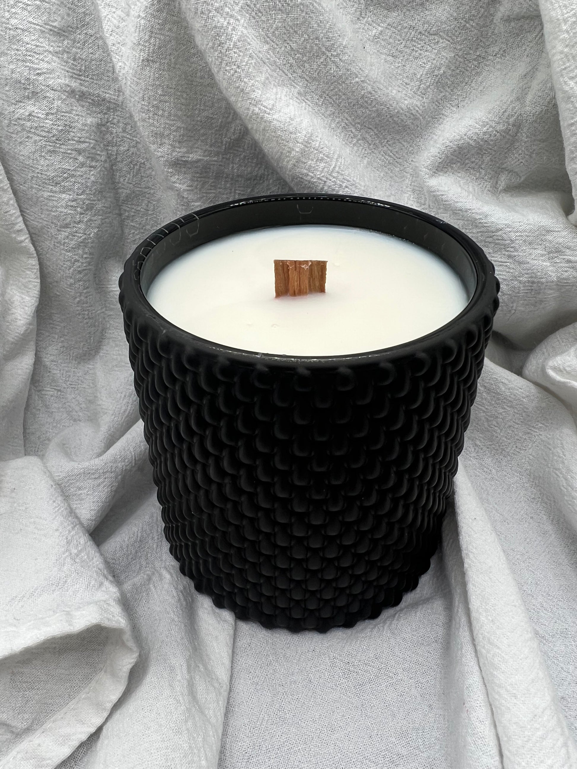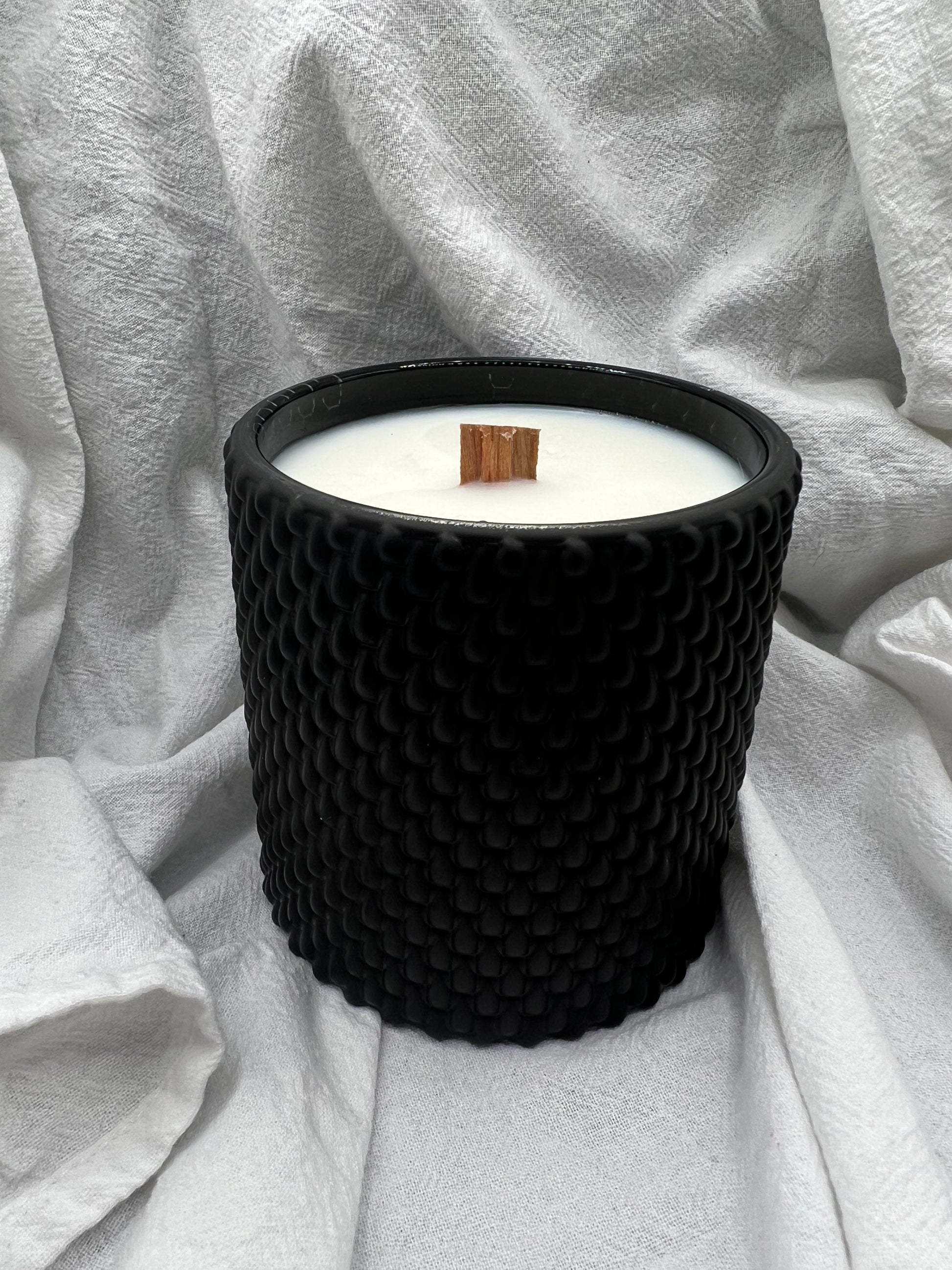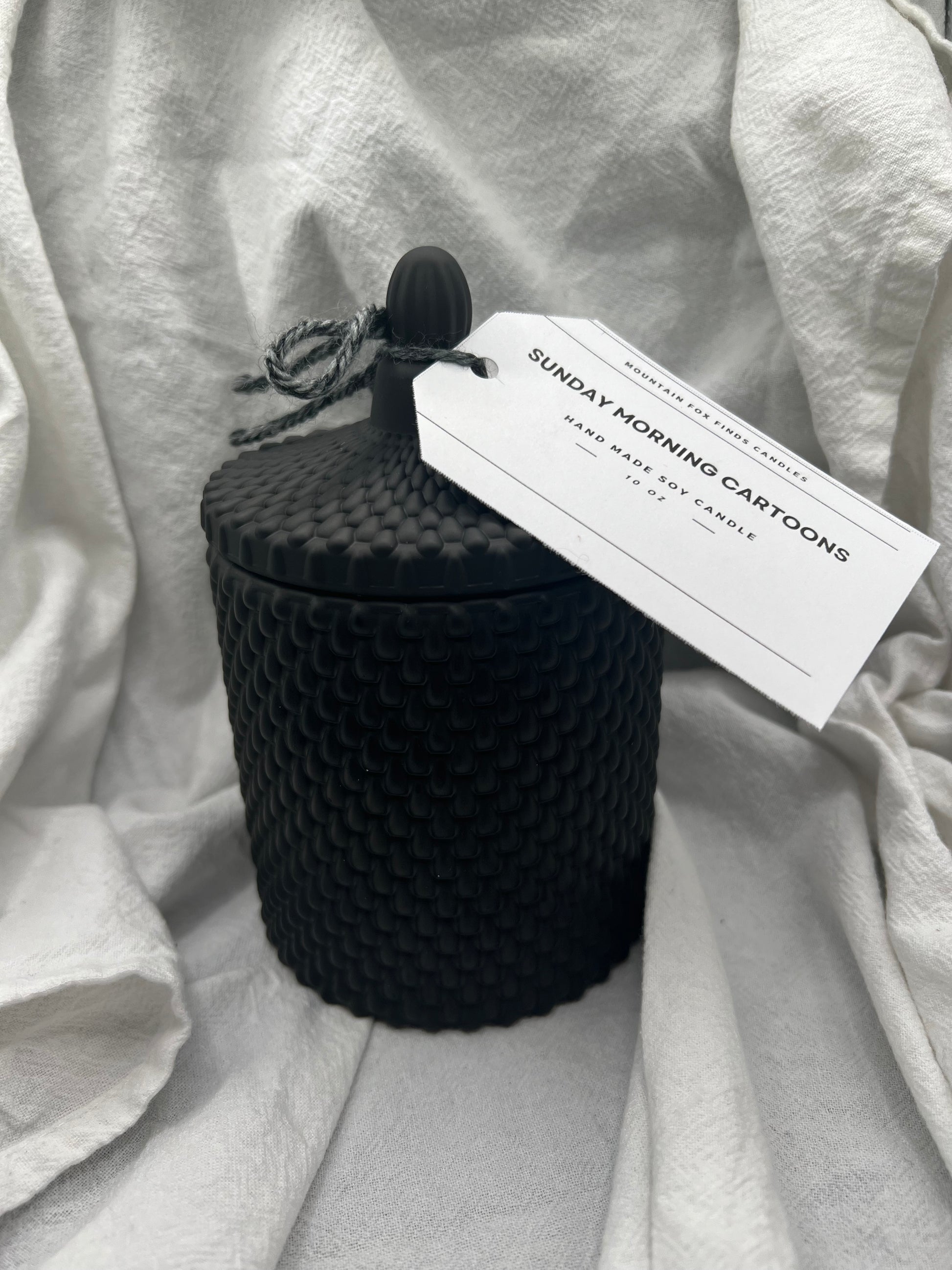 Ribbed jar in matte black with ornate lid! This comes in the scent "Sunday Morning Cartoons"