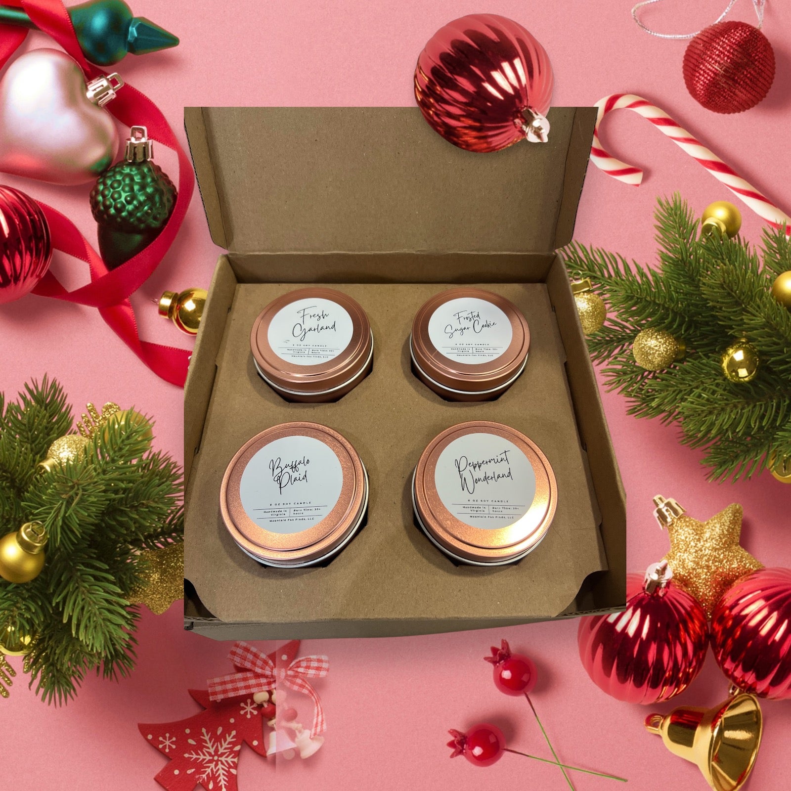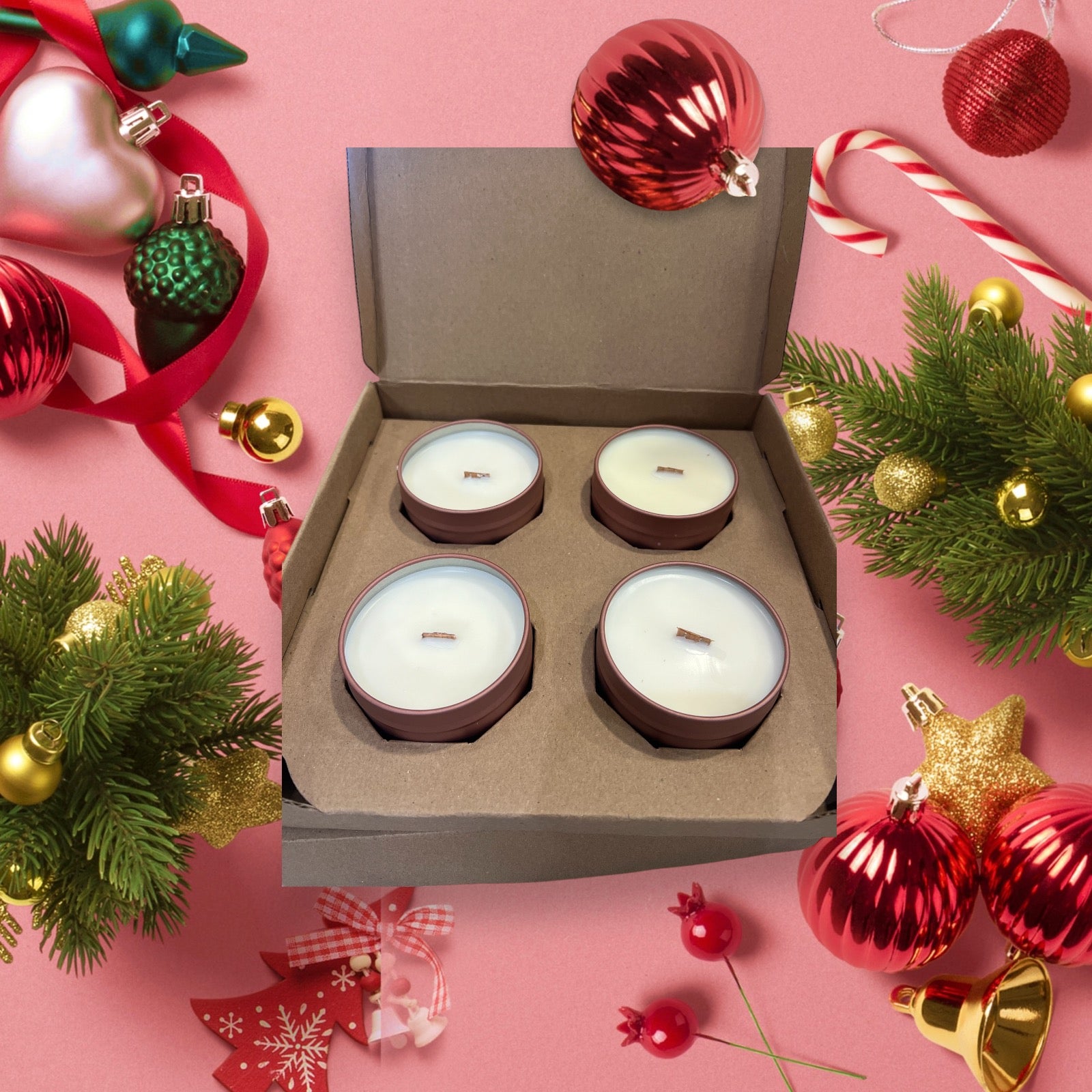 Makes a great gift! Includes 4 of our 6 oz candle tins from our winter collection
